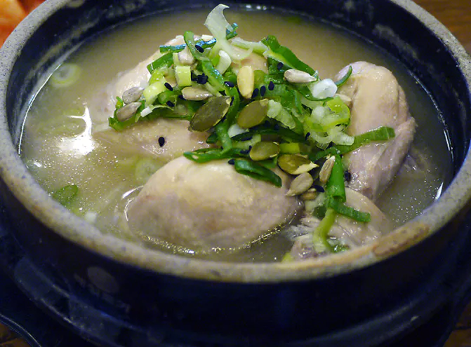 삼계탕은 한국 전통 음식 중 하나로, 다양한 영양소가 풍부하게 함유된 식품입니다. 이 맛있고 건강한 요리는 밤, 대추, 황기, 인삼, 마늘, 엄나무, 감초 등 다양한 종류의 약재들과 닭고기, 쌀로 만들어집니다.